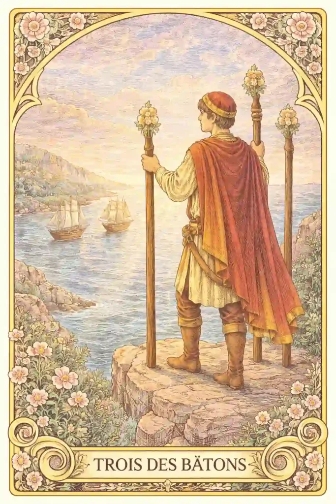 タロットカード「ワンド3(Three of Wands)」の意味をわかりやすく解説。正位置・逆位置の解釈から、恋愛運・仕事運・金運・スピリチュアルメッセージまで詳しく紹介します。初心者にも理解しやすい内容です。